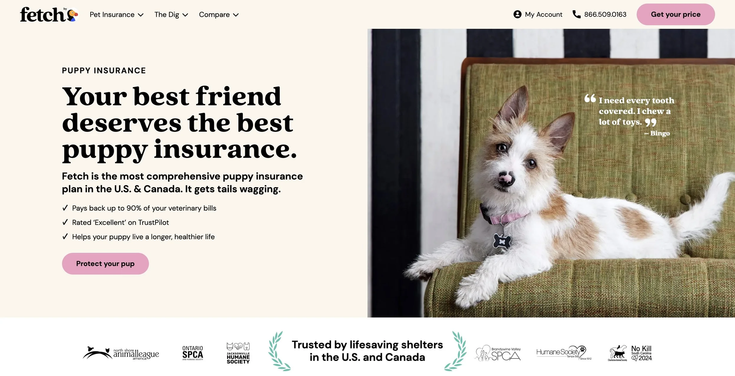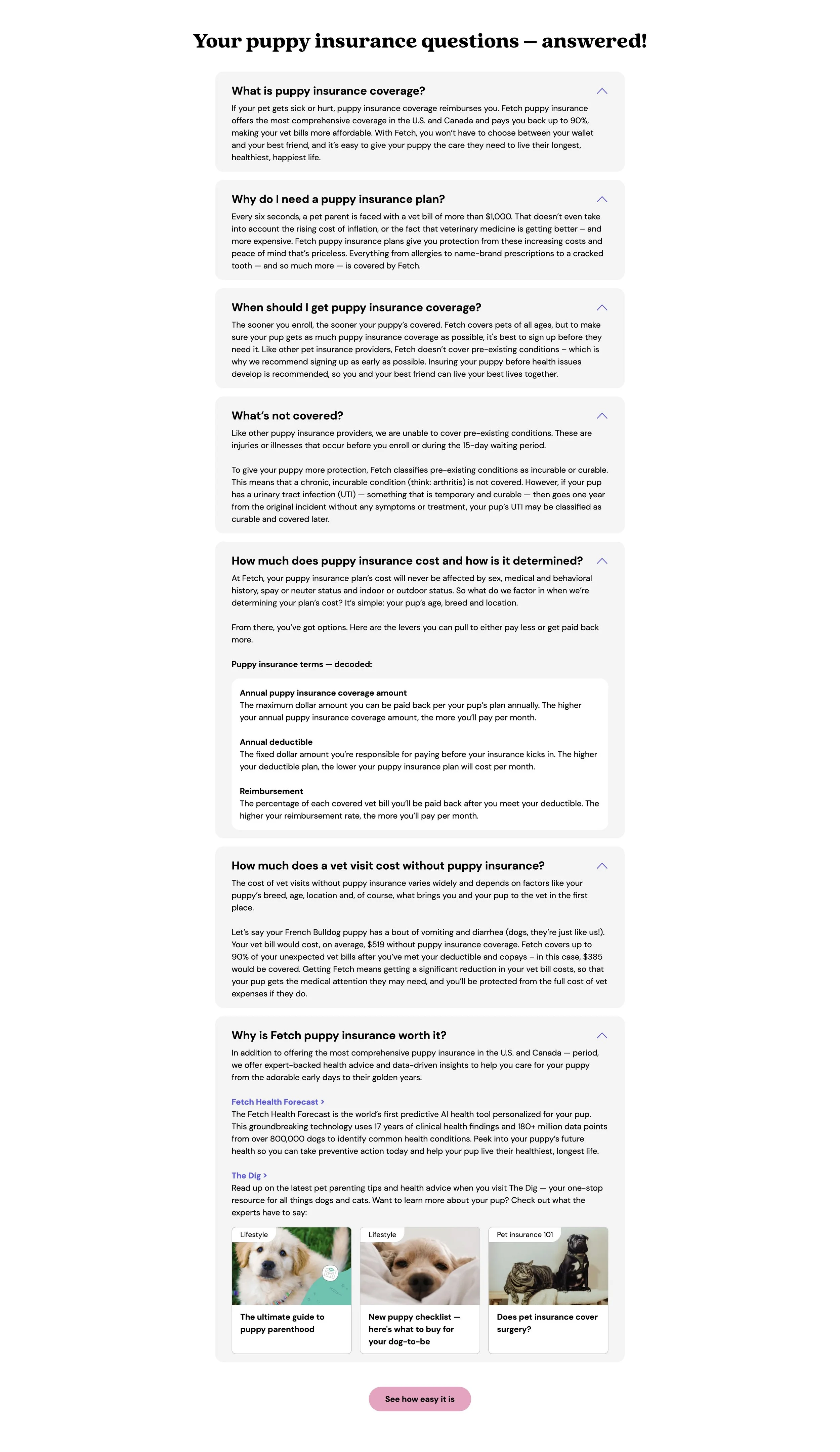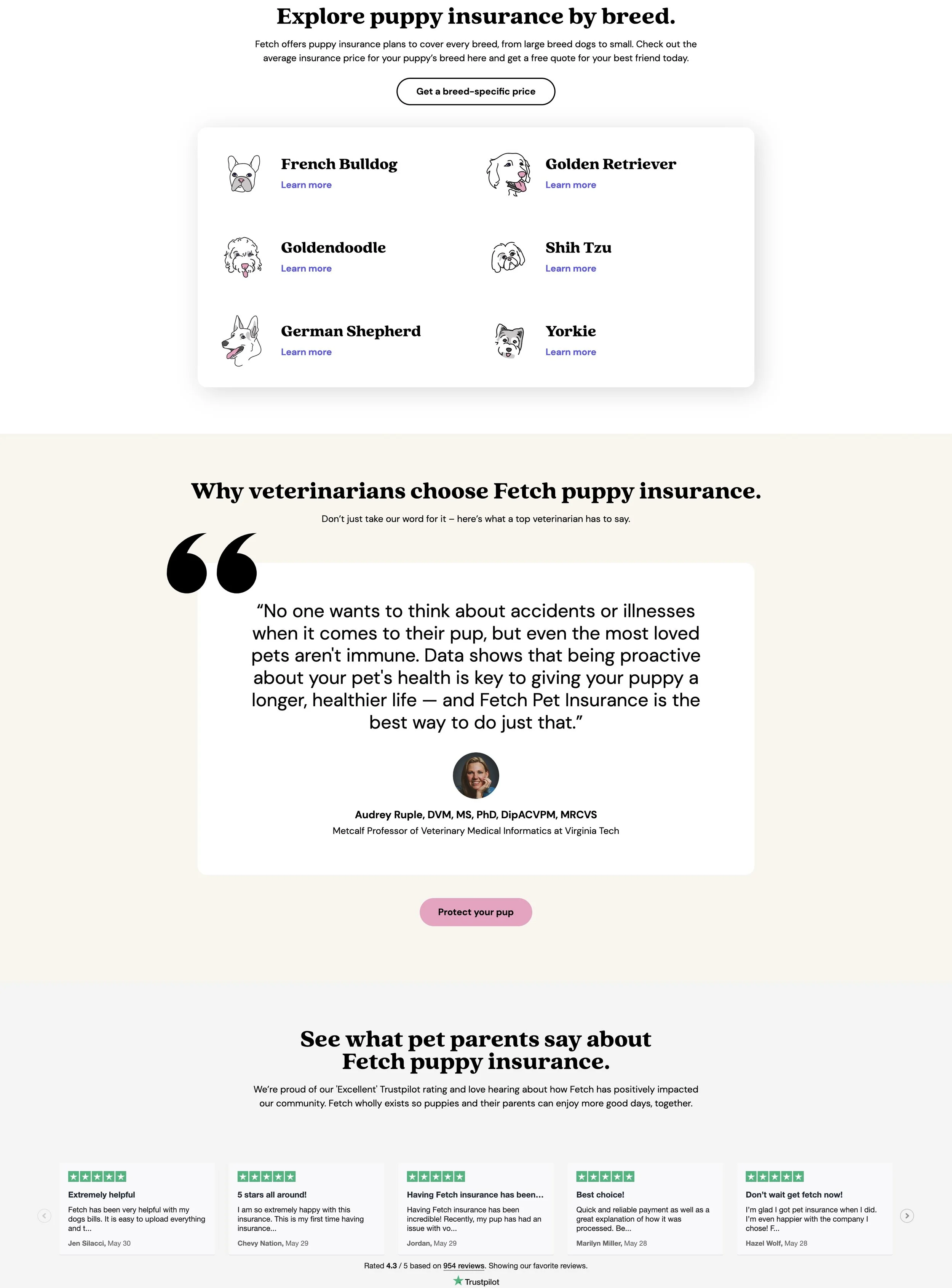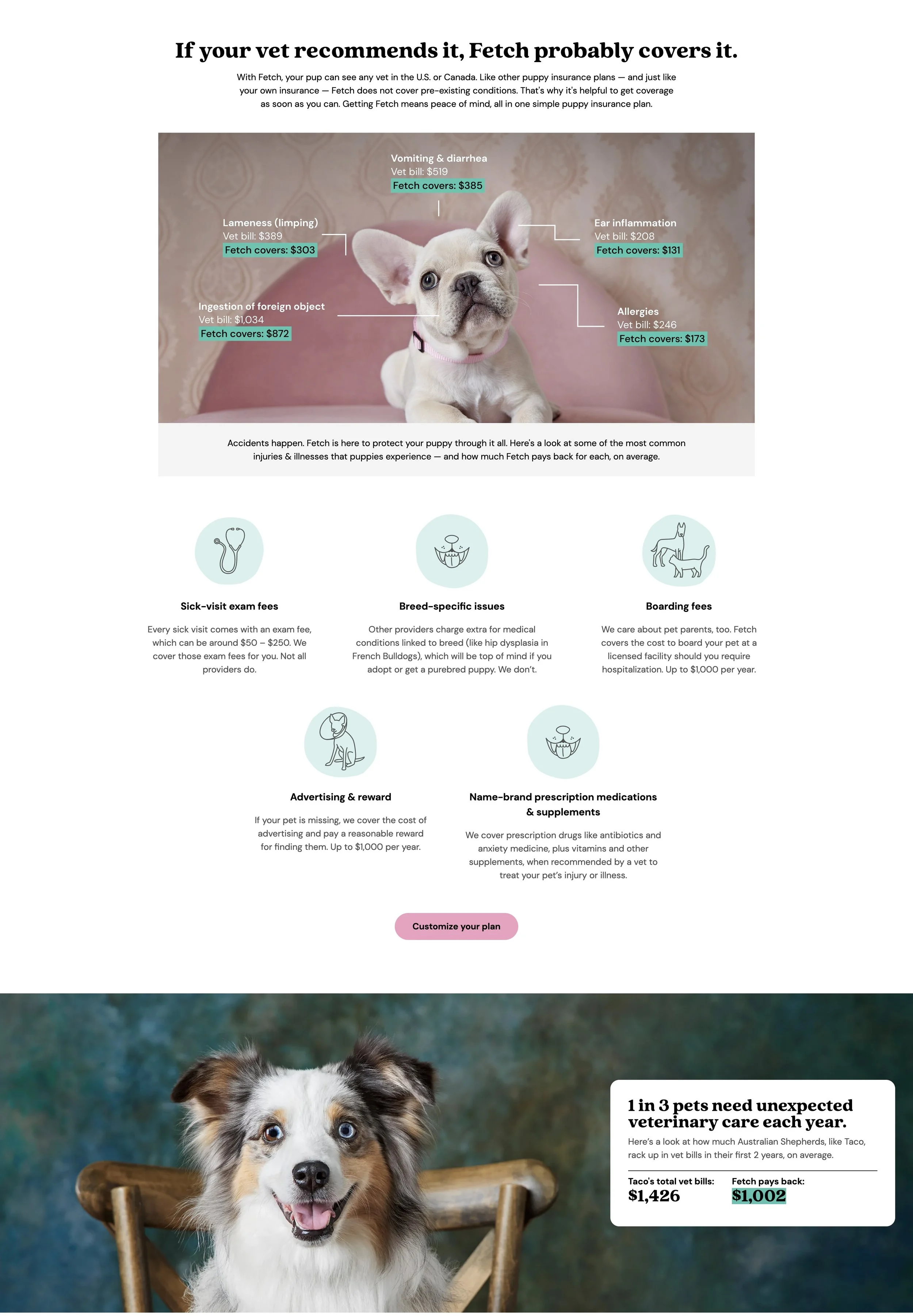 Fetch is a pet insurance company in the U.S. and Canada. The goal of this landing page was to engage and convert new customers, plus boost website SEO.