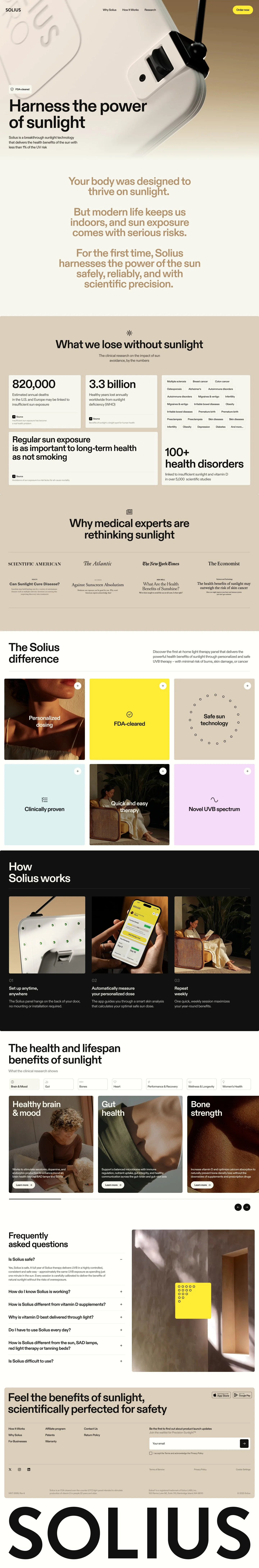 As the project's lead content designer and copywriter, my job was to translate complex clinical research and FDA compliance requirements into marketing copy. Our goal was to position Solius as a breakthrough medical device that delivers the health benefits of sunlight without the risks of burns, aging or cancer.